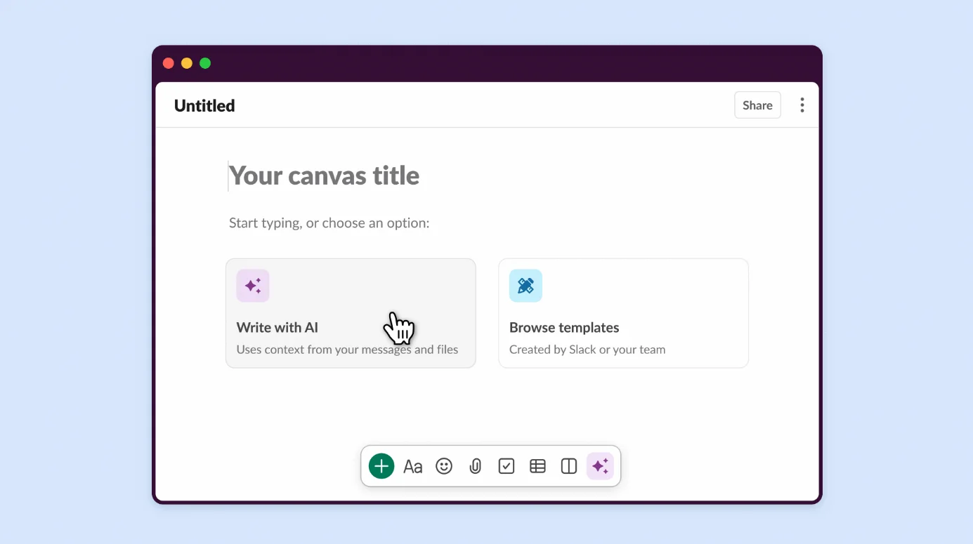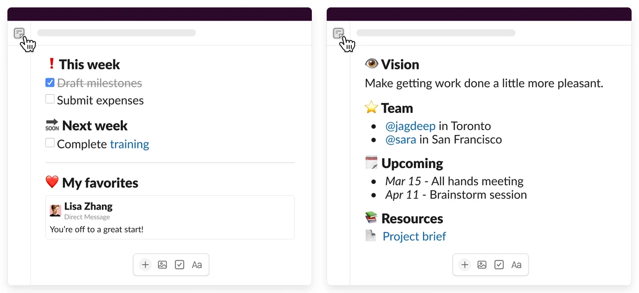 슬랙 캔버스(Canvas): 텍스트, 이미지, 링크 등을 자유롭게 편집하고 문서 작성할 수 있어요. 원하는 템플릿을 선택해 작성하거나, 사용자 지정 템플릿을 만들 수도 있어요.