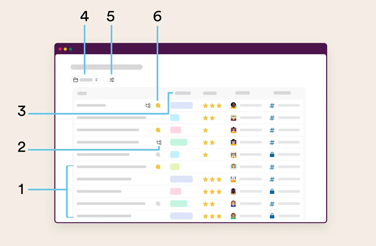 1) 항목, 2) 하위 작업, 3) 필드, 4) 보기, 5) 필터 및 레이아웃, 6) 스레드 / 출처: Slack AI 스레드 및 채널 요약: 클릭 한 번이면 AI가 스레드나 채널 대화를 자동으로 정리해 핵심만 빠르게 확인할 수 있어요.