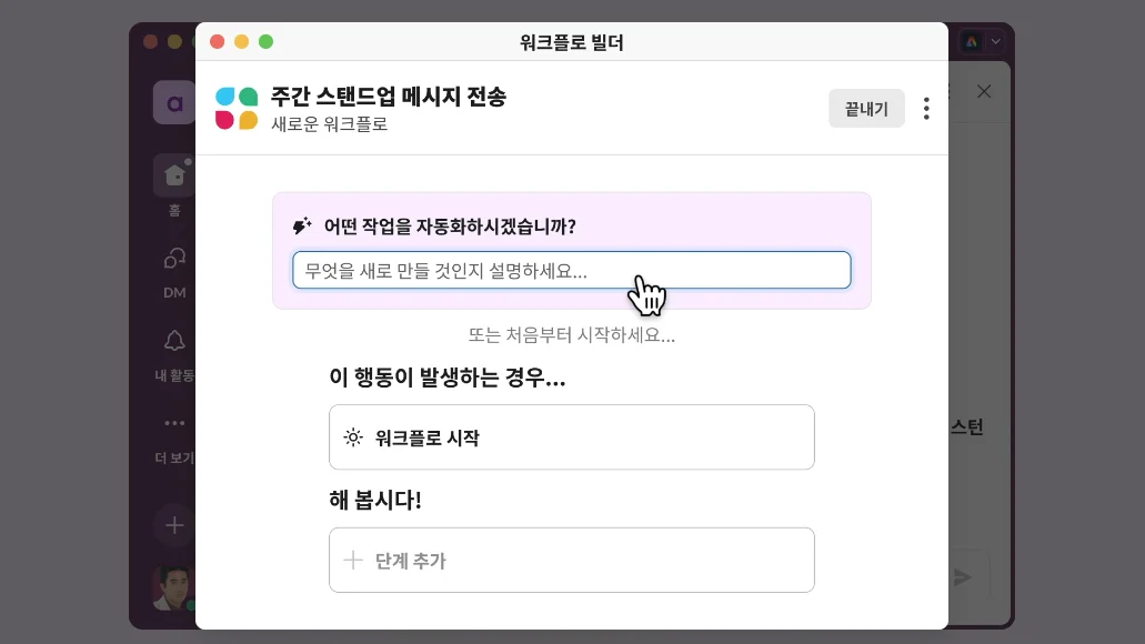 사용자 지정 워크플로 단계: 사용자 지정 워크플로를 만들어 팀 상황에 맞게 Slack 내부 프로세스를 직접 설계할 수 있어요.