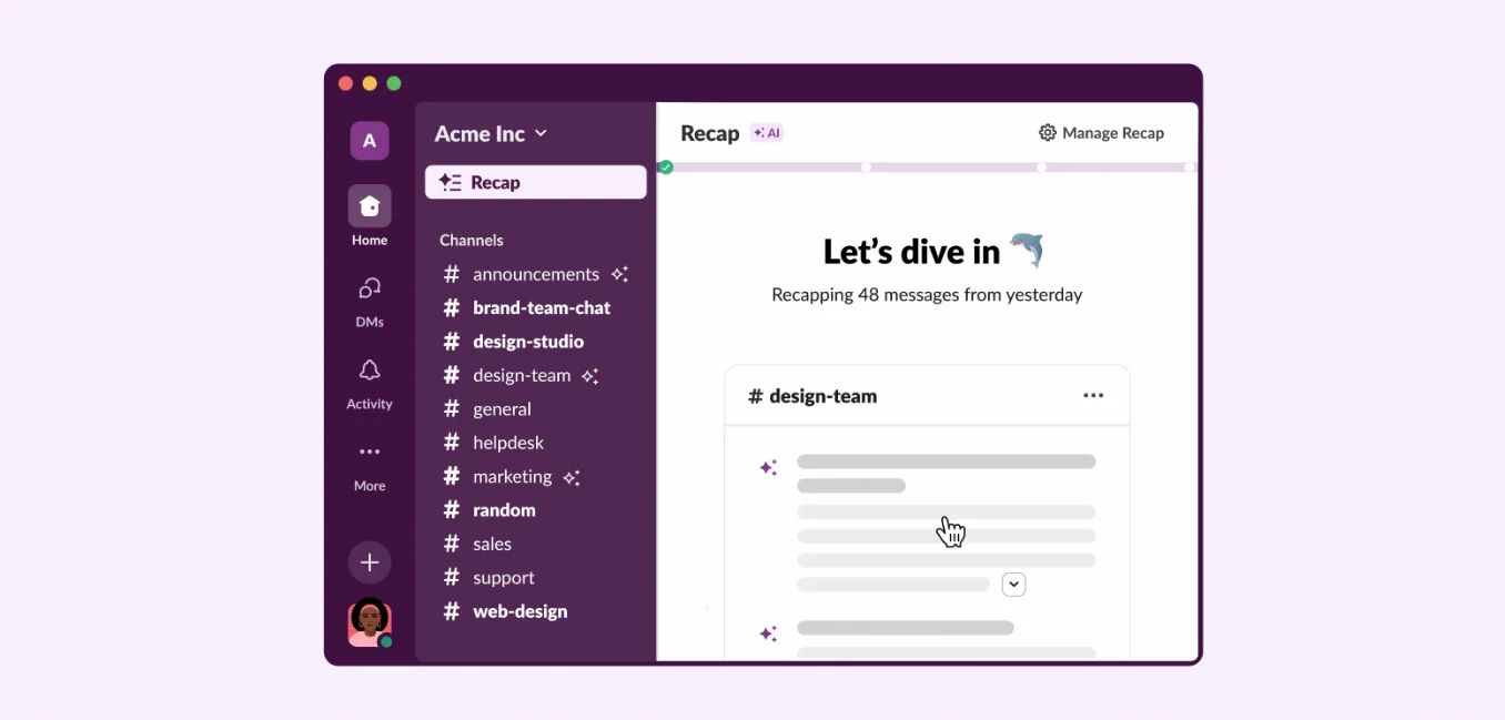 출처: Slack 놓친 내용 한눈에 보기: 읽지 않은 채널이나 메시지에 대해 사용자 지정한 활동을 AI가 요약해서 보여줘요. 매일 아침, 전날 놓친 사항을 한눈에 정리해서 받아볼 수도 있어요.