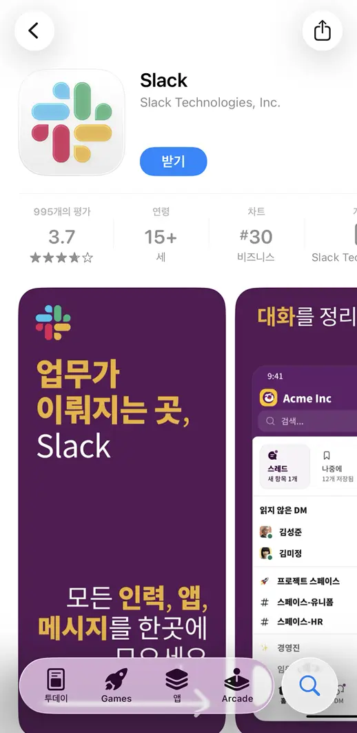 슬랙혹은Slack을 검색해요.받기버튼을 누르면 슬랙 다운로드가 시작돼요.또는, 슬랙 iOS 모바일 버전 다운로드 페이지에 접속하여