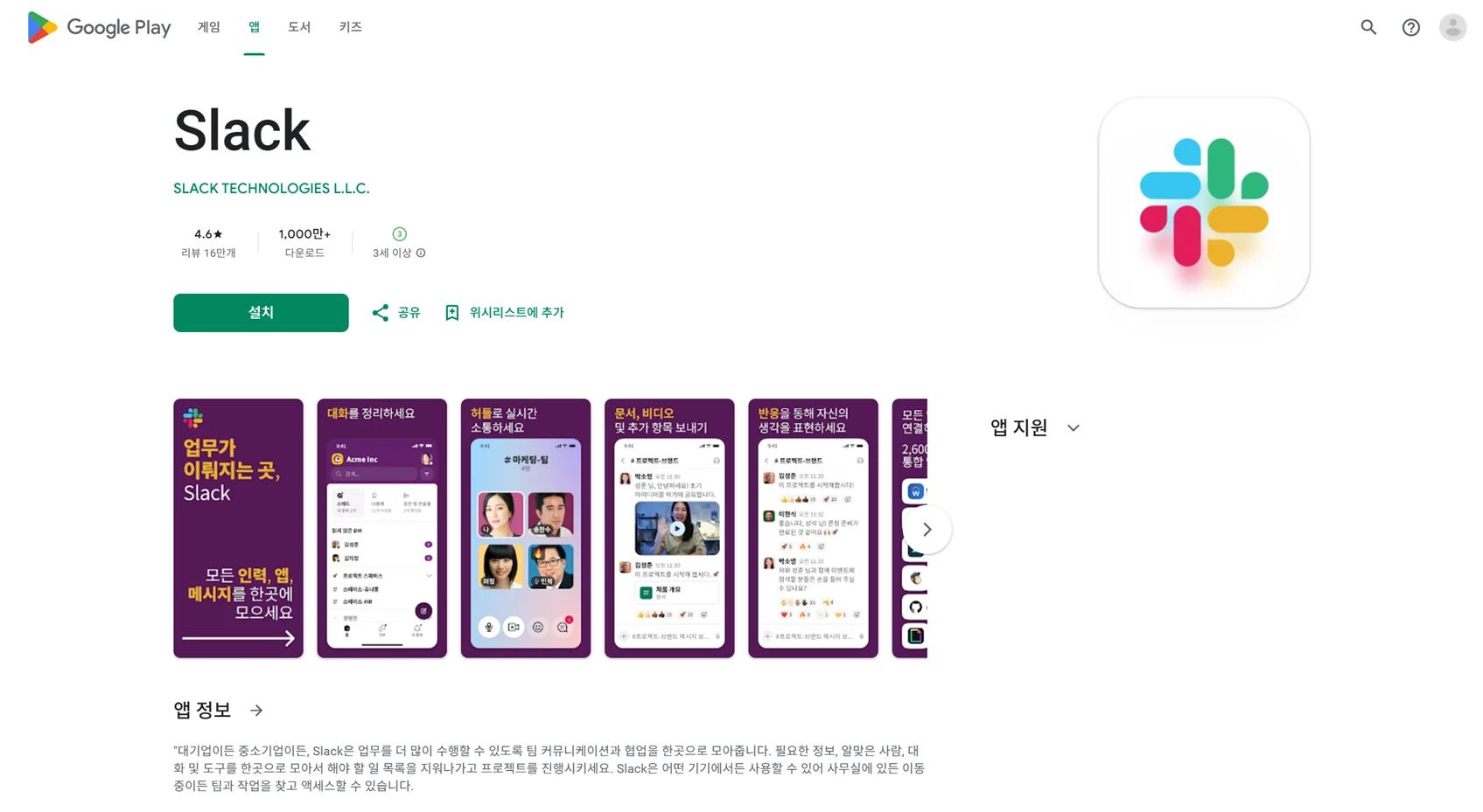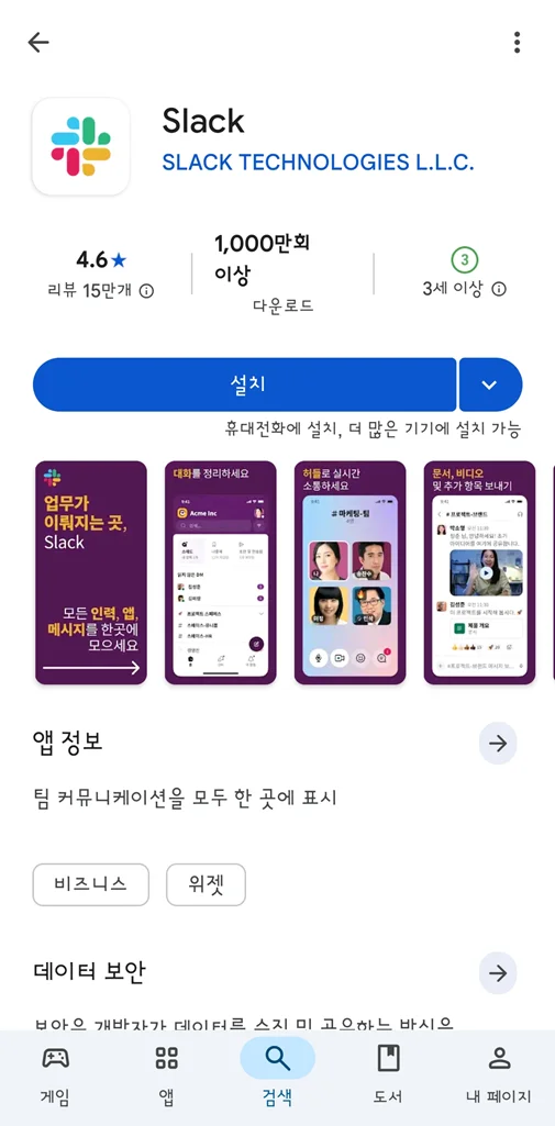 설치버튼을 눌러 슬랙을 설치할 수 있어요.설치가 완료되면 Play 스토어 내부의