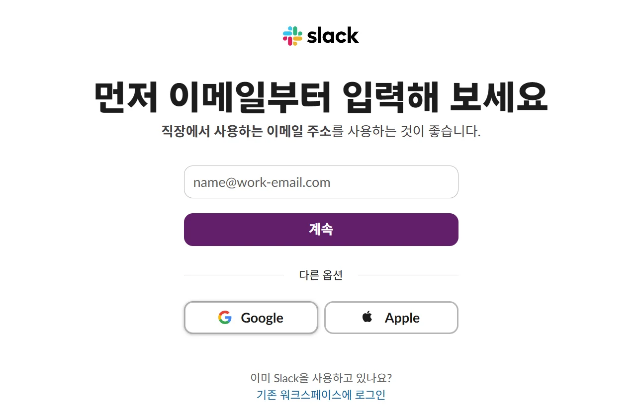 사용하고자 하는 이메일로 로그인을 하면 슬랙을 시작할 수 있어요.