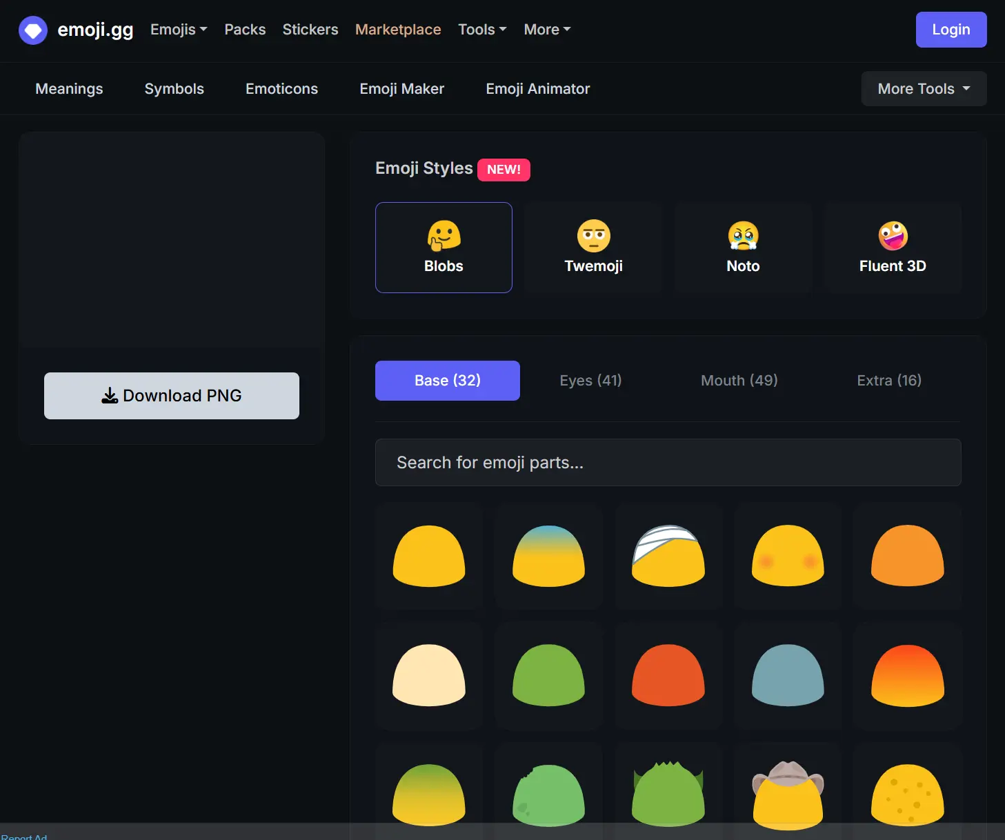Emoji Styles에서 원하는 형태의 캐릭터를 선택해요.Base,Eyes,Mouth순서대로 마음에 드는 조합을 선택해요.Download PNG를 눌러 만든 이모지를 다운로드 받으면 돼요.