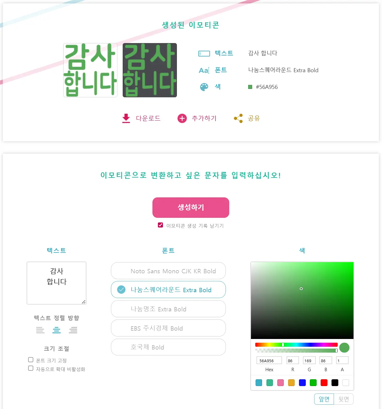 텍스트 입력란에 이모지로 만들고 싶은 문구를 입력해요.글자 색상은