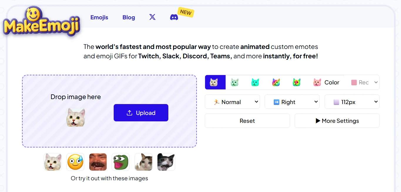 MakeEmoji는 사용자가 업로드한 이미지를 자동으로 GIF 형태의 움직이는 이모지로 변환해주는 사이트입니다. 움직임이 있는 이모지를 활용하고 싶거나, 짧은 로고 애니메이션이나 간단한 밈 이모지를 제작하기에 적합해요.