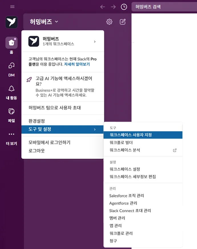 워크스페이스 이름을 클릭하고,도구 및 설정-워크스페이스 사용자 지정을 선택해요.