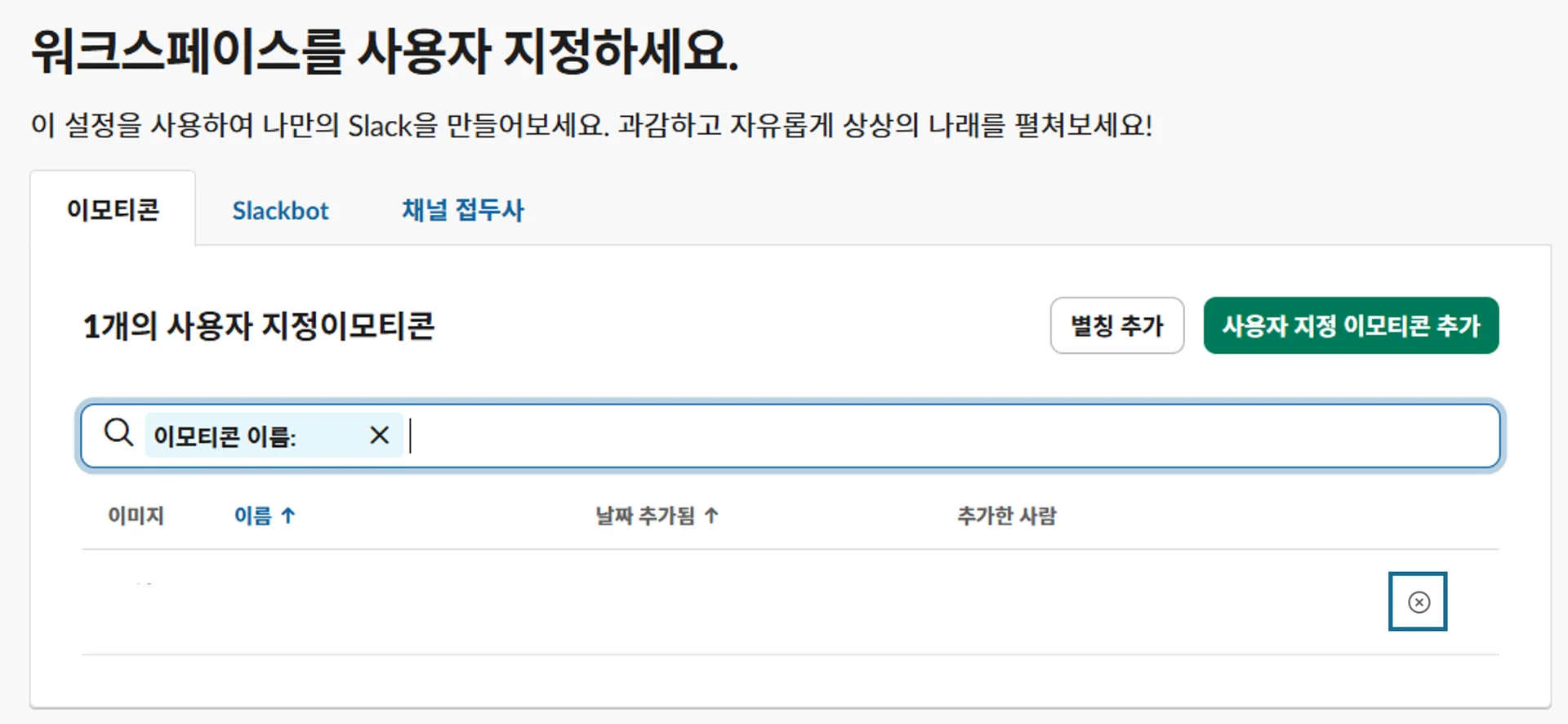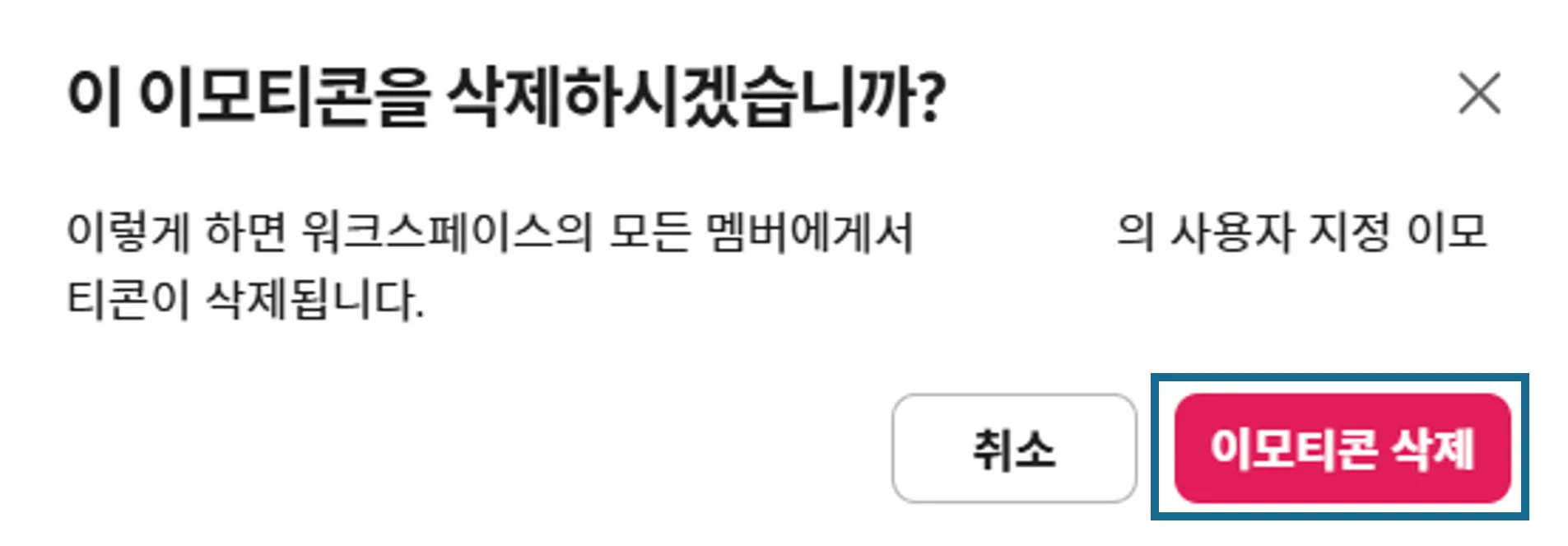 이모티콘 삭제를 누르면 해당 이모지는 삭제되고, 더이상 슬랙에서 사용할 수 없어요.