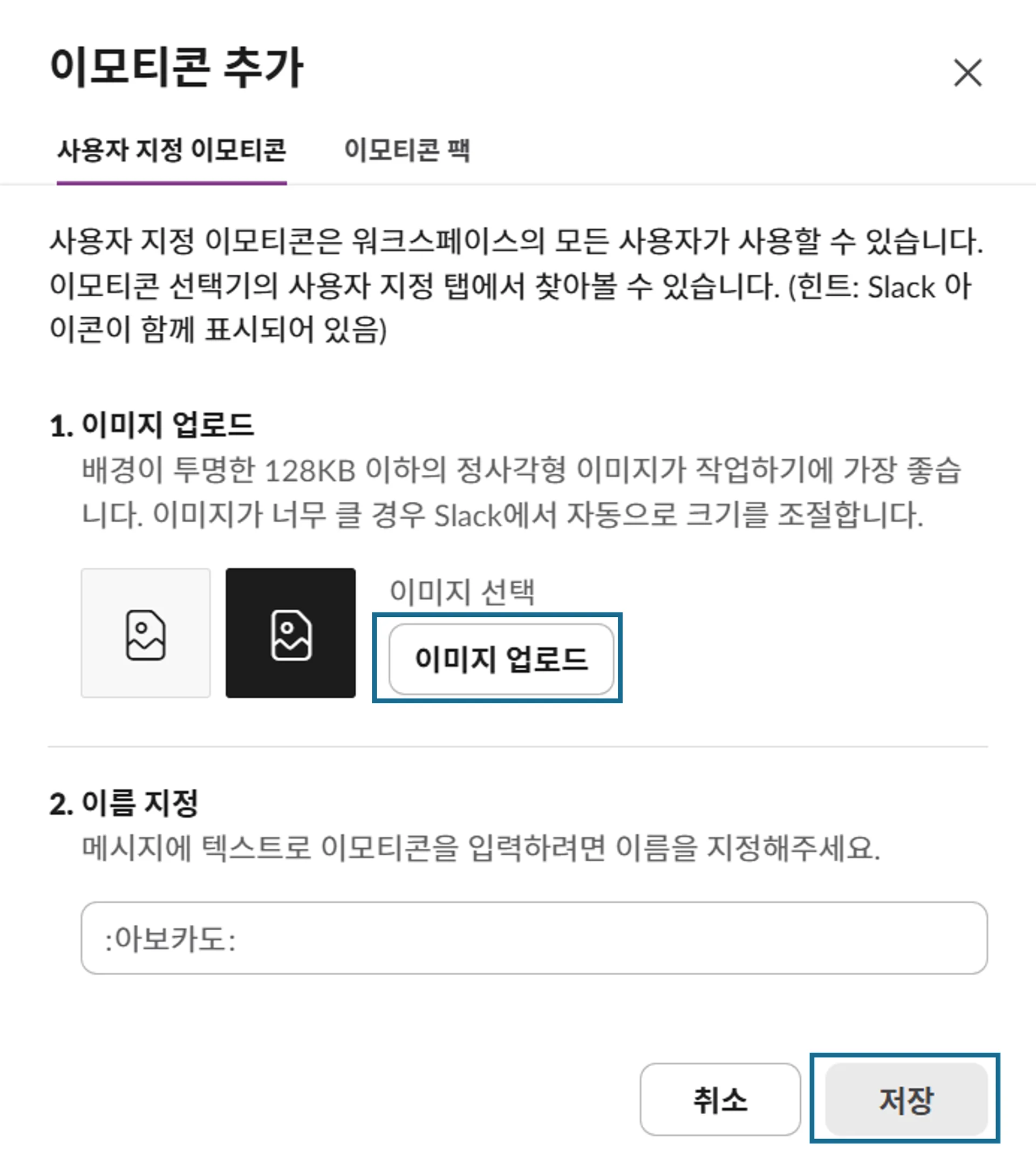 이름 지정에서 이름을 설정하면, 이모지 목록에서 검색하거나 채팅에서:이모지_이름:처럼 정해놓은 이름으로 이모지를 사용할 수 있어요. 모든 설정을 마쳤다면저장을 눌러요.이모지 목록의 최하단
