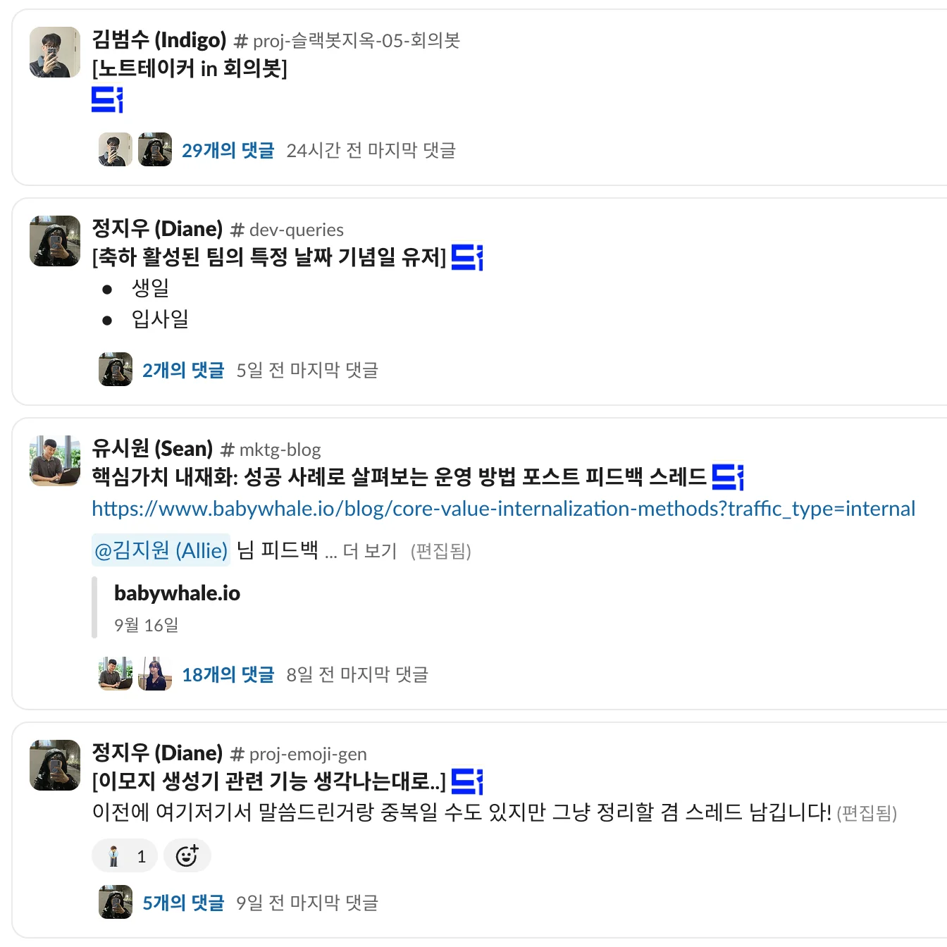 슬랙에서는 기본 이모지만 써도 충분히 효율적으로 소통할 수 있지만, 우리 조직만의 커스텀 이모지를 만들면 효과가 훨씬 커집니다. 로고나 캐릭터, 핵심가치를 담은 이모지를 직접 제작해 쓰면 소속감이 커지고, 일상적인 대화 속에서도 자연스럽게 조직문화를 경험할 수 있어요.