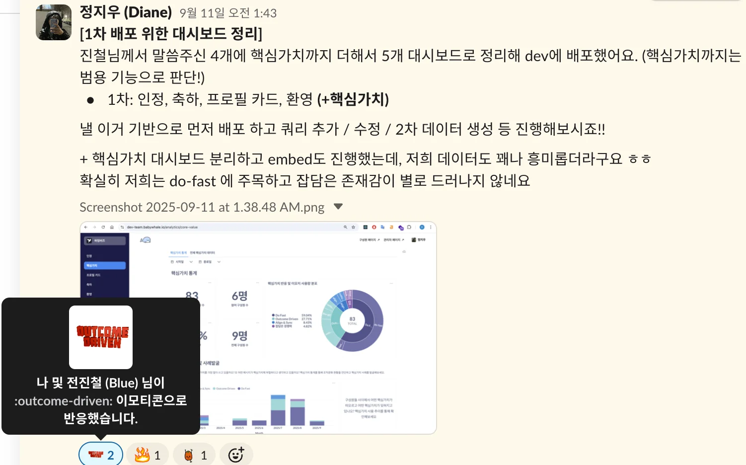 허밍버즈는 조직의 핵심가치를 시각적인 이모지로 만들어, 일상 속에서 활용하고 있어요. 예를 들어 핵심가치인 :Outcome-Driven:, :Do-Fast: 등을 이모지로 표현해 사용합니다. 구성원이 핵심가치에 맞는 행동을 했을 때 해당 메시지에 관련 이모지를 달아주면, 공개적으로 인정하는 효과가 생겨요. 이렇게 하면 구성원들은 자신의 행동이 조직의 가치와 직접 연결되어 있다는 점을 실시간으로 체감할 수 있습니다. 동시에 아기고래의 핵심가치 기능과 연결하여, 핵심가치 실천 우수 사례를 발굴하고 데이터 기반 핵심가채 내재화를 실천하고 있어요.