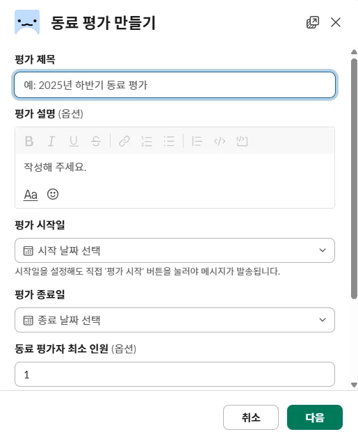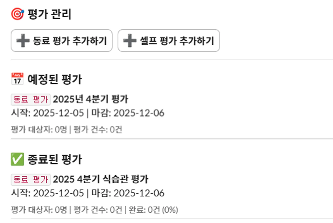관리자는 평가 시작일과 종료일, 동료 평가자 인원 등을 설정할 수 있어요. 평가를 정해진 기간 단위로 운영하면 운영자는 평가가 언제 시작되고 종료되는지 기준을 잡고 관리할 수 있고, 구성원 역시 평가에 참여해야 하는 시점을 명확하게 인지할 수 있습니다. 이 방식은 평가를 연말이나 분기 말에 몰아서 진행하는 운영 방식에서 벗어나 조직의 업무 흐름에 맞춰 성과를 정리할 수 있도록 돕습니다.