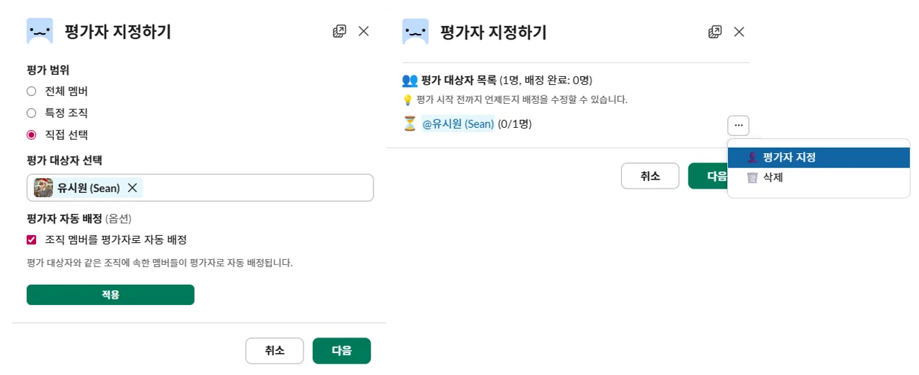 다면평가에서 가장 중요한 요소 중 하나는 평가자 구성이에요. 모든 구성원이 모든 사람을 평가하는 구조는 공정해 보일 수 있지만 실제로는 업무 이해도가 낮은 평가가 섞이기 쉽습니다. 아기고래는 평가자를 전체 멤버, 특정 조직, 직접 선택 방식으로 지정할 수 있어, 평가 대상자와 업무적 연관도가 높은 사람들만 평가자로 포함시킬 수 있어요.