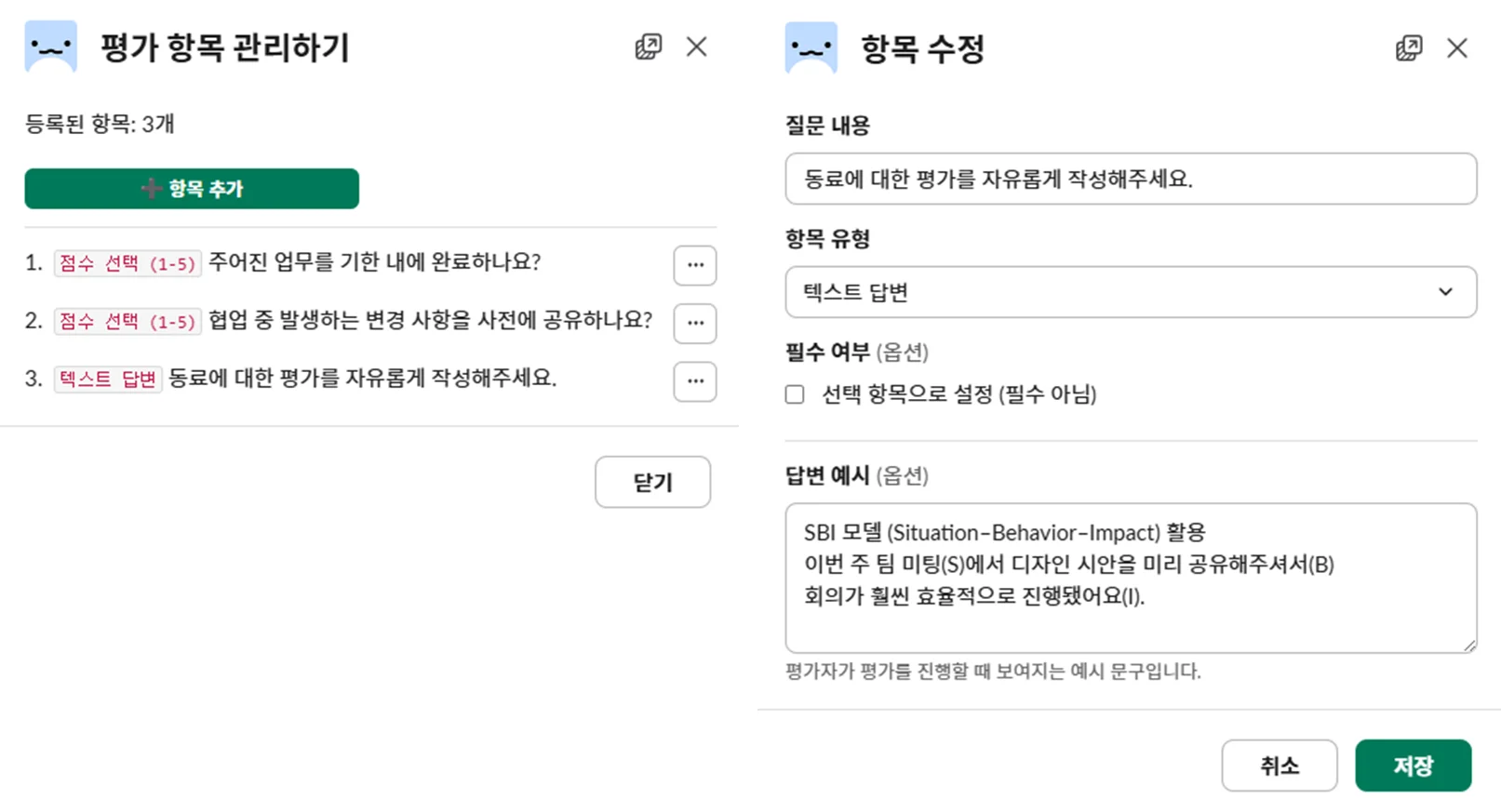 성과관리에서 평가 항목은 조직의 상황과 기준에 맞게 설정하는 것이 중요해요. 평가 항목은 협업 과정에서의 역할 수행이나 의사결정, 실제 기여 행동을 확인할 수 있는 질문으로 구성되어야 해요. 서술형 항목의 경우, 답변 예시를 함께 제공하면 평가자가 어떤 내용을 중심으로 작성하면 되는지 바로 이해할 수 있습니다. 예를 들어, SBI (상황-행동-결과) 모델과 같은 예시를 제공하면 실제 업무 경험을 중심으로 한 피드백이 남기 쉬워져요.