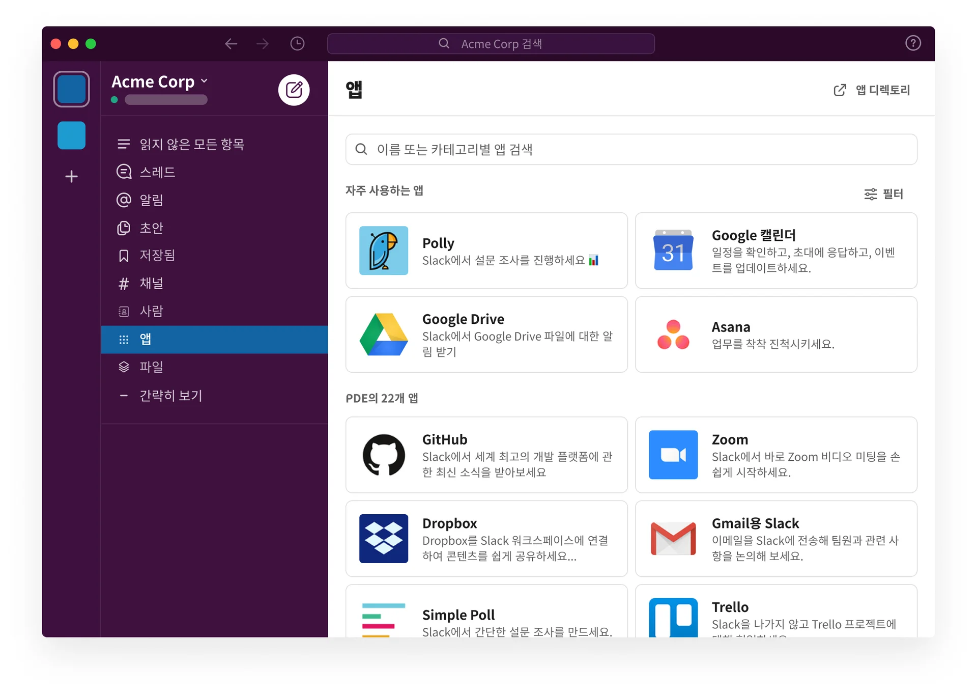 외부 앱 및 서비스 통합이 무제한으로 가능해요. 슬랙 앱 디렉터리에 있는 Google Drive, Trello, Jira 등의 모든 앱을 제약 없이 추가하여 사용할 수 있어요.