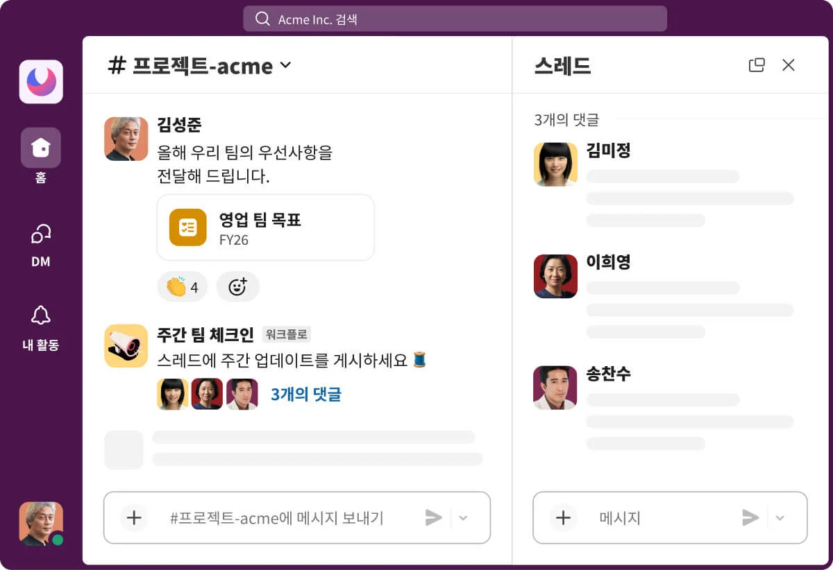최대 250개의 외부 조직과 채널 단위로 협업이 가능해요. 워크스페이스의 채널을 외부 팀과 연결해 실시간 대화와 파일 공유가 가능하고, 접근 권한도 세분화할 수 있어요.