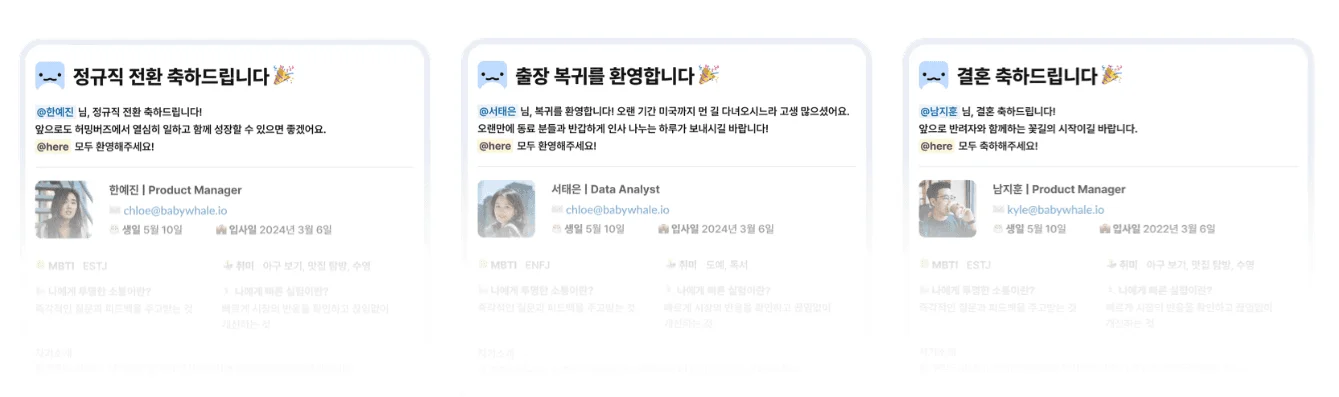 또 정해진 메시지만 보내지는 게 아니라 각 구성원마다의 프로필 카드와 함께 축하 메시지를 전달하기 때문에, 카드 뒤에 사람이 있는 ‘진짜 축하’를 전할 수 있어요.