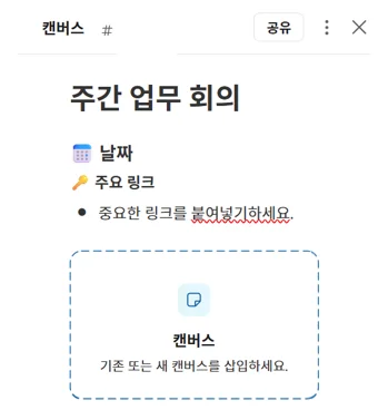 회의 중에 떠오른 아이디어나 회의 내용을 바로 정리하고 싶을 때는 캔버스 기능을 활용해보세요. 캔버스는 슬랙 내에서 바로 열 수 있는 공동 문서 공간으로, 회의 메모·할 일 목록·링크 등을 팀원과 함께 실시간으로 기록할 수 있어요.