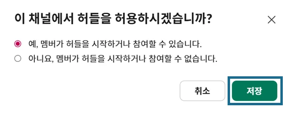 슬랙 채널에서 허들이 시작되지 않거나 참여 버튼이 보이지 않는다면, 채널 설정에서 허들 사용 권한이 제한되어 있을 가능성이 있어요. 아래 경로에서 설정을 확인해보세요.