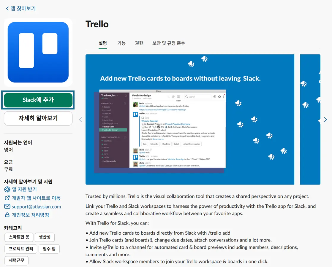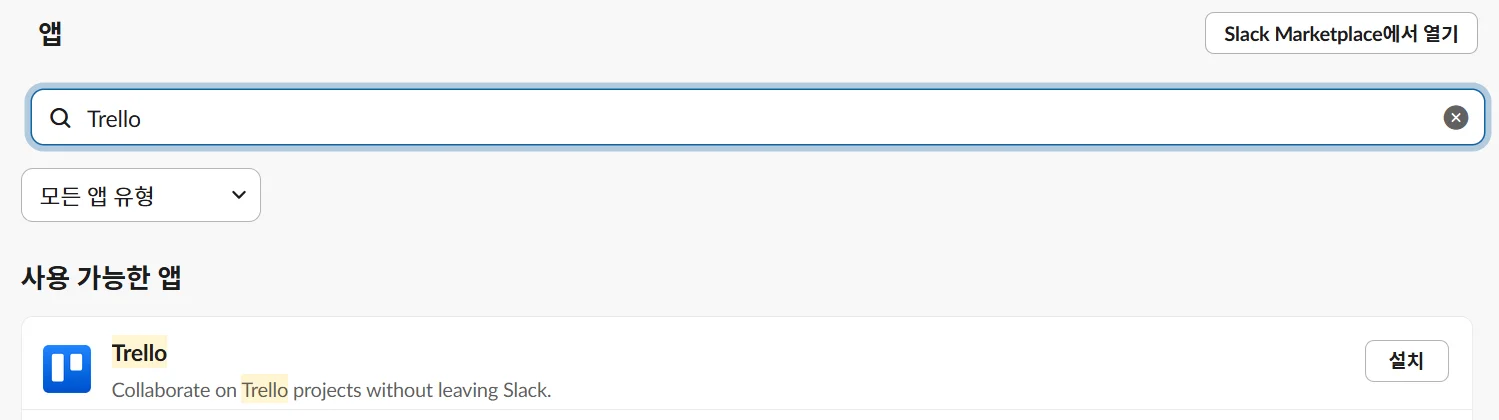 슬랙 앱 마켓플레이스에서 트렐로(Trello) 설치하기
