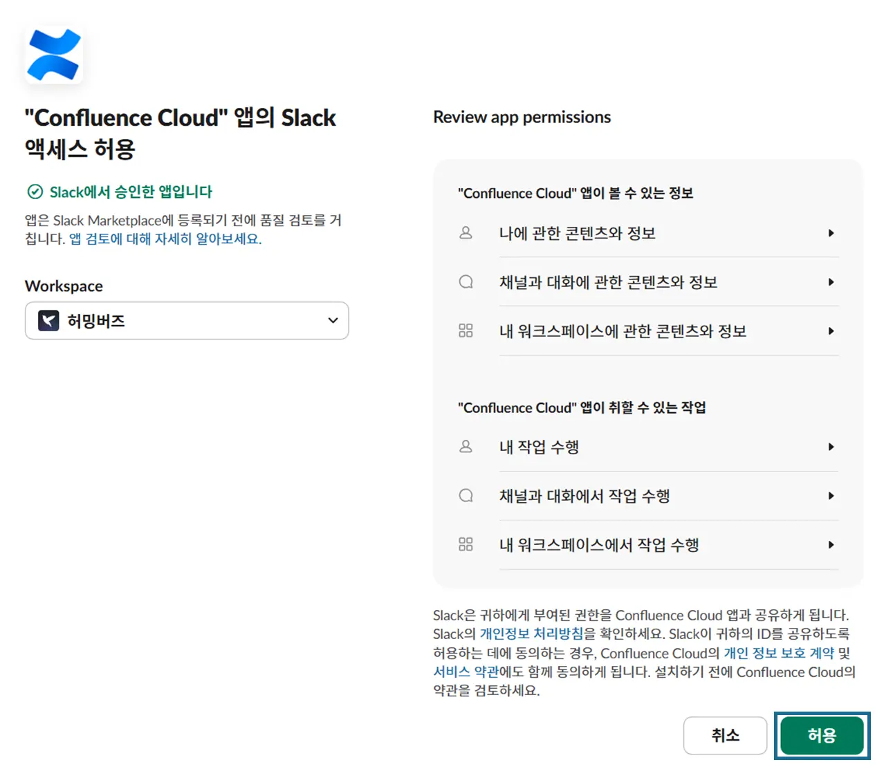 허용버 튼을 눌러요. 사용하고자 하는 컨플루언스 계정에 로그인 해요.슬랙 워크스페이스에 컨플루언스 앱이 추가되었다는 메시지가 표시되면 설치가 완료된 것이에요. 사이드바의 앱 목록에서 컨플루언스 아이콘을 확인할 수 있습니다.