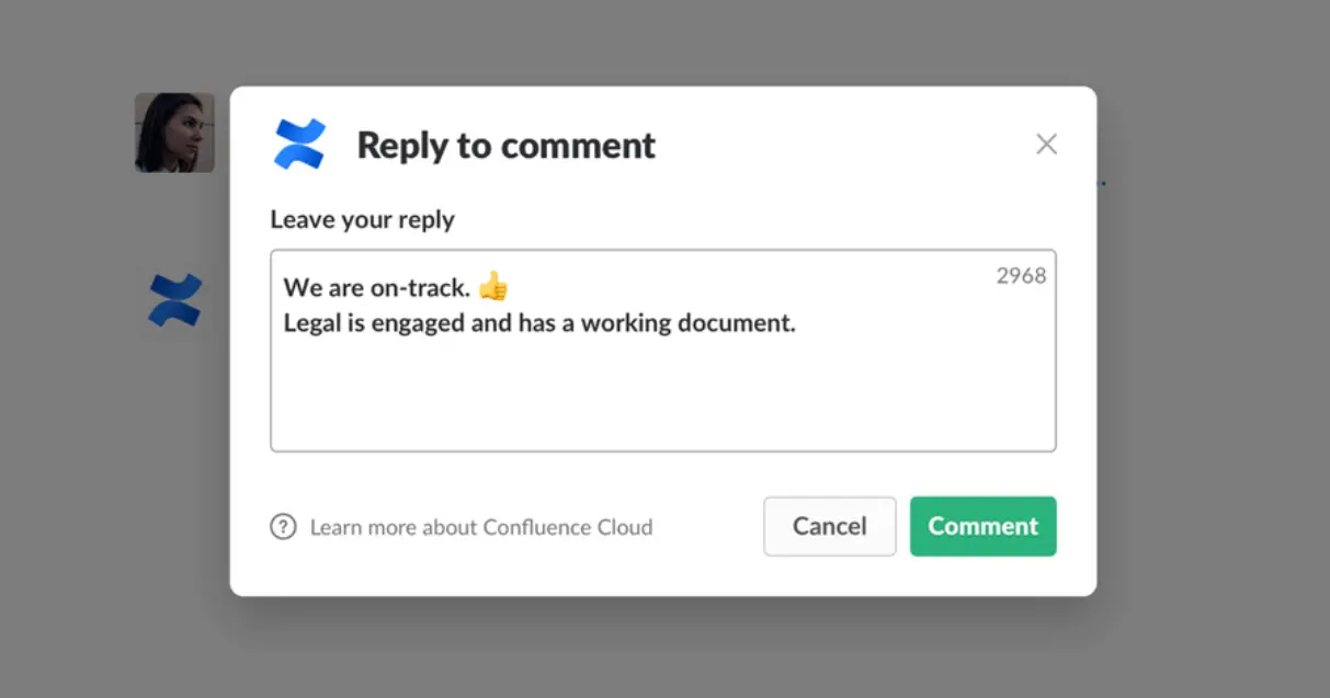 컨플루언스 문서에 댓글이 달리면 슬랙으로 알림이 오고 슬랙에서 바로 답글을 남길 수 있어요. 알림 메시지에서 팝업창으로 바로 코멘트를 작성할 수 있고 작성한 내용은 컨플루언스 댓글로 그대로 등록됩니다. 슬랙에서 바로 피드백을 주고받을 수 있어서 문서 확인이나 의견 전달이 훨씬 빠르게 이루어집니다.