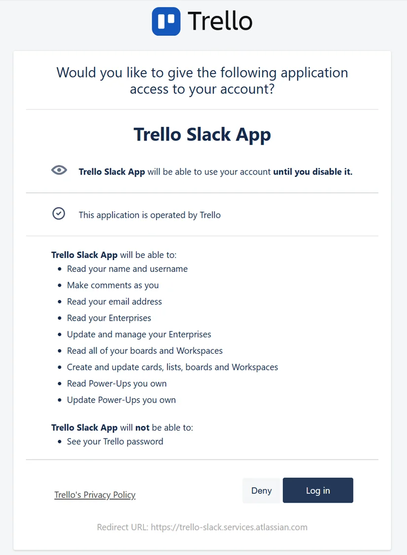 Slack에 추가버튼을 클릭하면 슬랙과 트렐로연동을 위한 권한 승인이 진행됩니다.