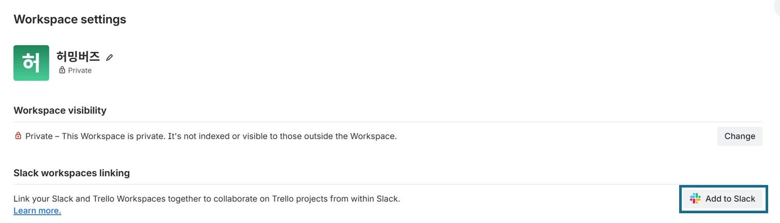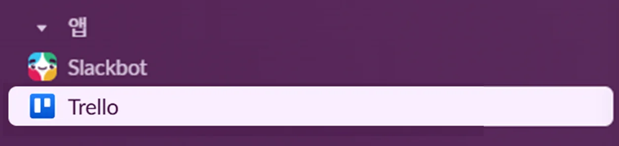 Settings탭에서Add to Slack을 누르면 슬랙과의 연동이 완료돼요.슬랙 워크스페이스에 트렐로 앱이 추가되었다는 메시지가 표시되면 설치가 완료된 것이에요. 사이드바의 앱 목록에서 트렐로 아이콘을 확인할 수 있습니다.