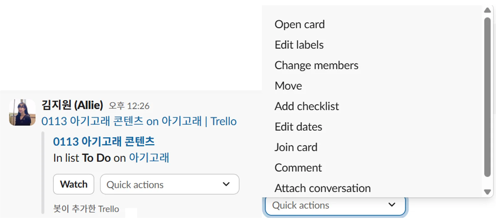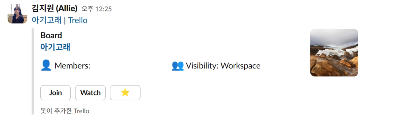 슬랙 채팅에 트렐로 보드나 카드 링크를 붙여넣으면 보드/카드 제목, 멤버 수 등 정보가 미리보기 카드 형태로 보여집니다. 이때 Join을 누르면 해당 보드에 자신을 멤버로 추가할 수 있어요. Quick actions를 통해 해당 카드에 관련한 다양한 동작도 수행할 수 있어요.