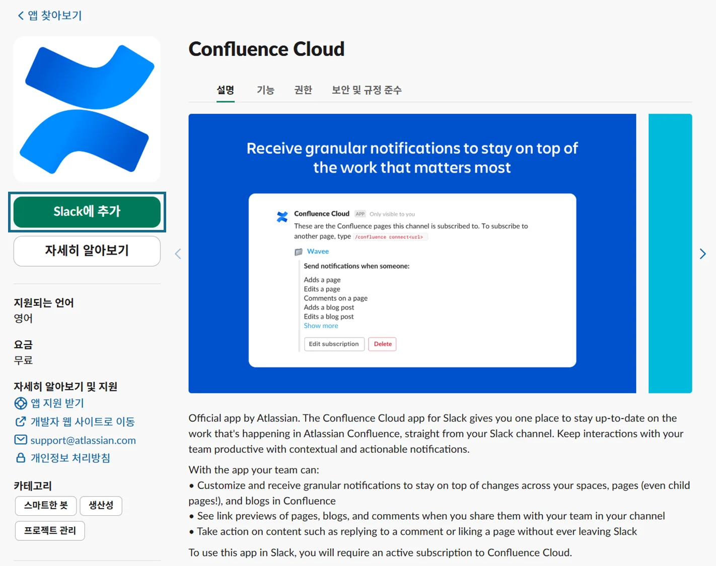Confluence를 입력하고 검색 결과에서 컨플루언스 클라우드 앱을 선택하면 슬랙 마켓플레이스 페이지로 이동합니다.