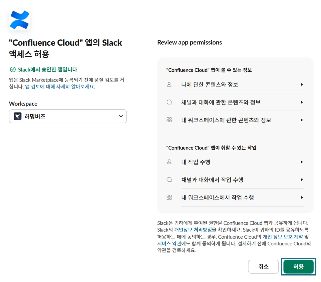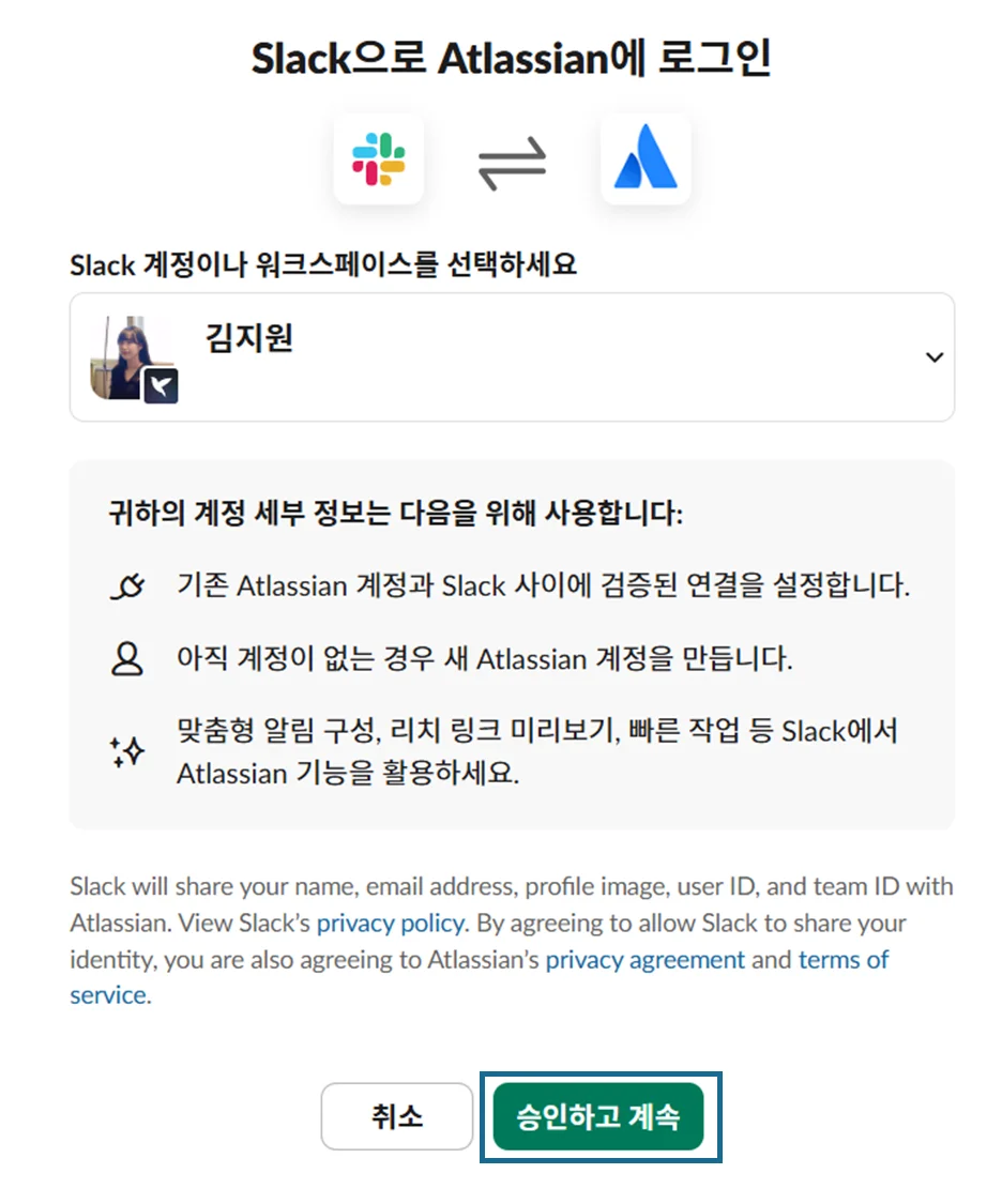 Slack에 추가버튼을 클릭하면 슬랙과 컨플루언스연동을 위한 권한 승인이 진행됩니다.