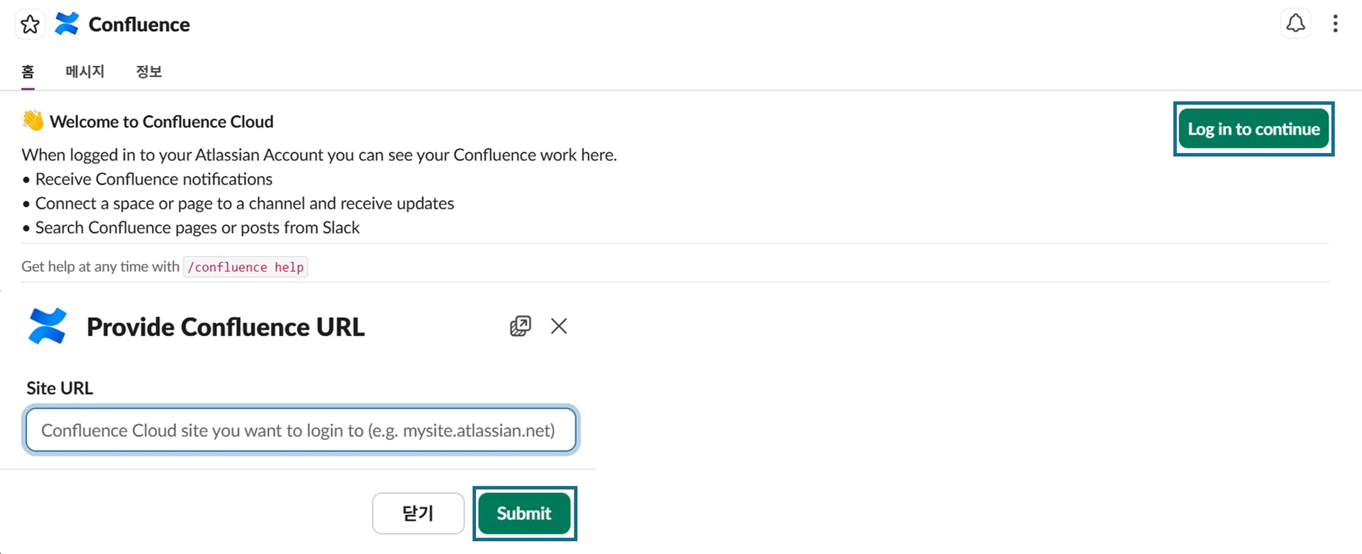 Log in to continue를 눌러 컨플루언스 계정을 슬랙과 연동할 수 있어요.mysite.atlassian.net형태의 사이트 링크를 붙여넣고Submit하면 슬랙과 연동 가능한 페이지도 이동합니다.Connect accounts를 누르고 엑세스를 허용하면 슬랙 계정과 컨플루언스가 연동됩니다.