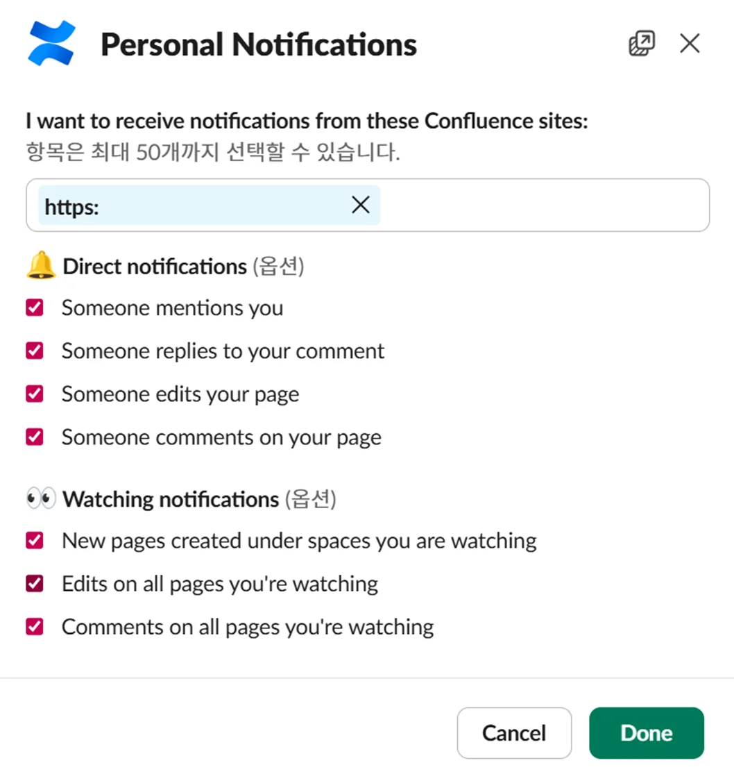 슬랙에 컨플루언스 앱을 연동하면 원하는 조건에 맞춰 알림을 세부적으로 설정할 수 있어요. 누군가 문서를 수정했을 때만 받고 싶거나, 보고 있는 페이지에 댓글이 달릴 때만 받고 싶다면 이 알림 설정 화면에서 필요한 항목만 골라 켜두면 됩니다.