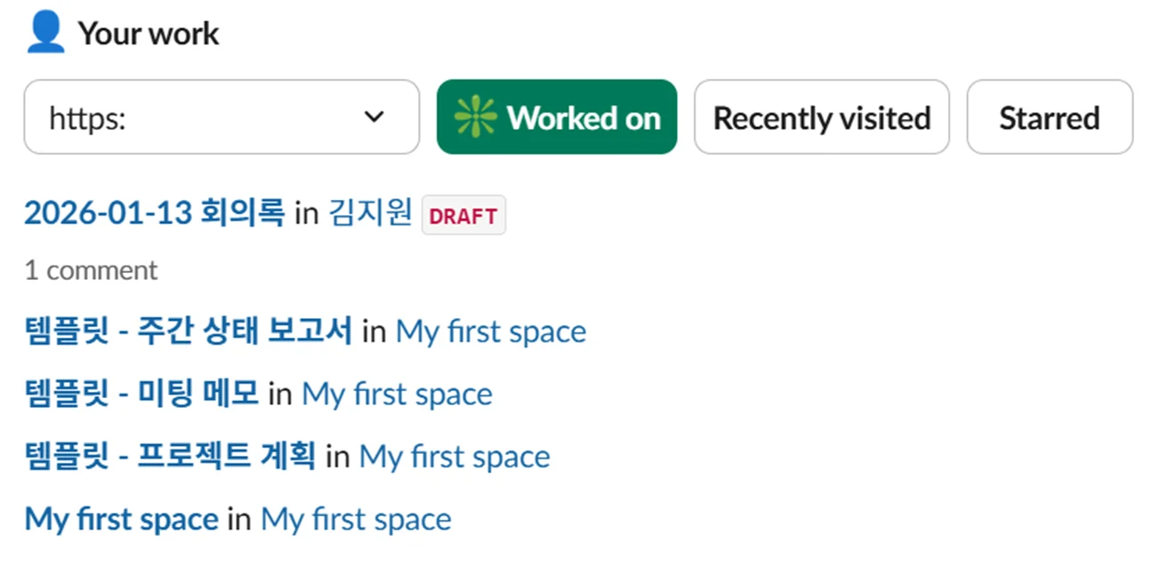 컨플루언스 앱 홈의 Your work 섹션을 통해 최근 작업한 문서들을 한눈에 확인할 수 있어요. Worked on 탭에서는 최근에 수정하거나 코멘트를 남긴 페이지가 리스트로 정리되어 나타나고, Recently visited 탭에서는 확인했던 문서들을 다시 찾아볼 수 있어요. 북마크처럼 자주 참고하는 페이지가 있다면 Starred 탭에서 따로 정리해둘 수 있습니다.