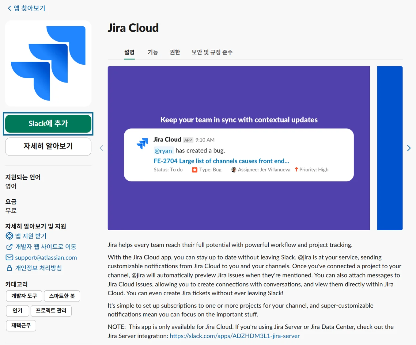 Jira를 입력하고 검색 결과에서 지라 클라우드 앱을 선택하면 슬랙 마켓플레이스 페이지로 이동합니다.
