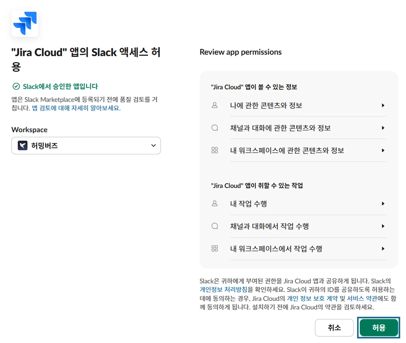 Slack에 추가버튼을 클릭하면 슬랙과 지라 연동을 위한 권한 승인이 진행됩니다.지라를 설치할 워크스페이스를 선택하고