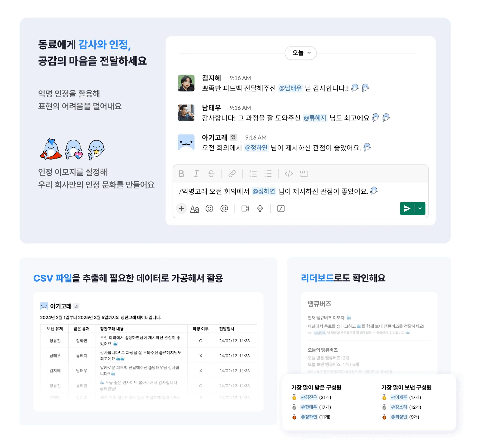 슬랙과 같은 디지털 기반의 업무 환경이 일상인 시대에 칭찬 문화는 단순히 ‘우리 칭찬 잘 합니다’와 같은 형식적인 요소가 아니라 팀의 단결력을 높이고 서로의 존재를 진심으로 인정하며 협력과 신뢰를 키워가는 핵심 요소입니다.
