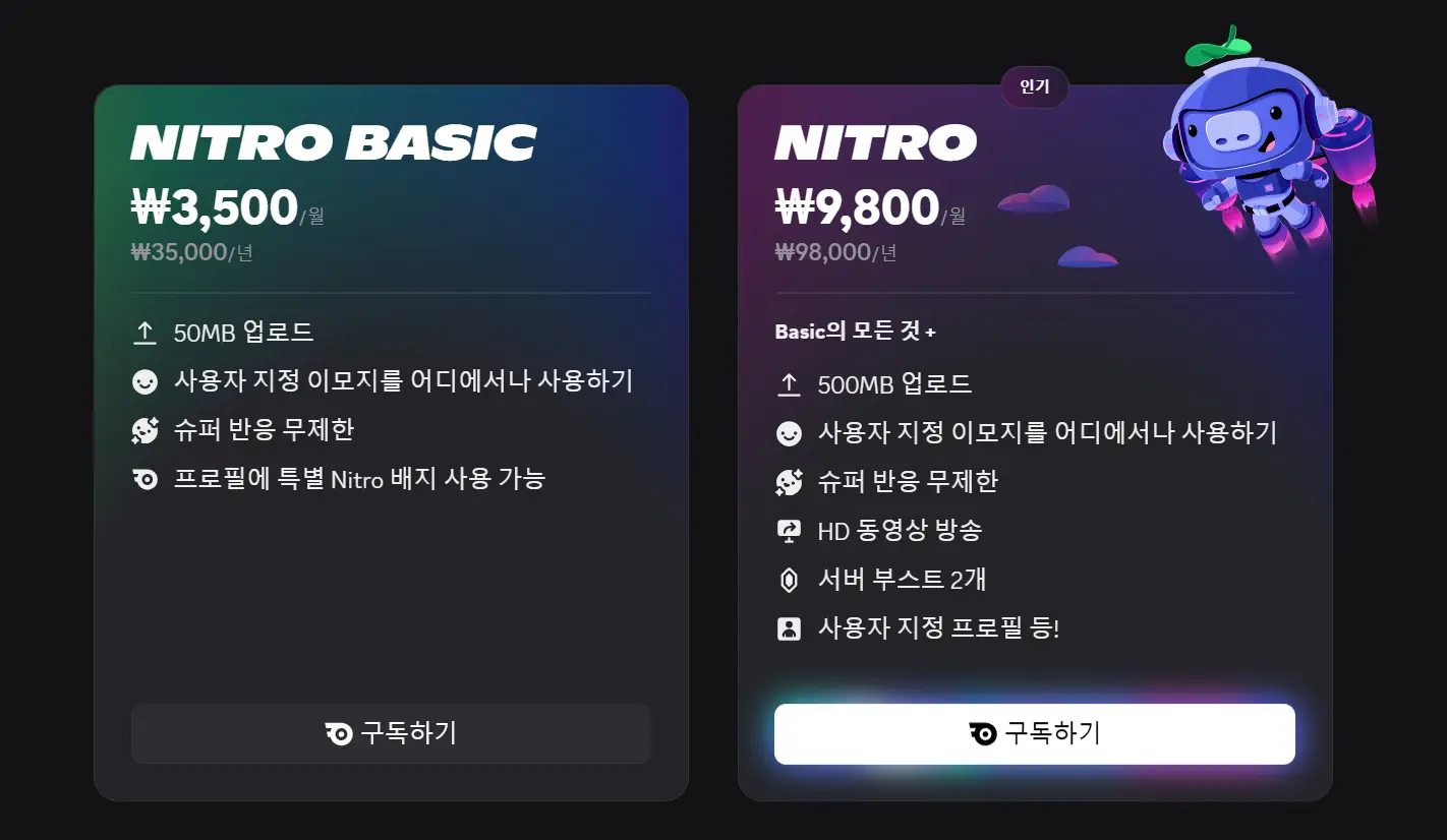디스코든 대부분의 기본 기능이 무료로 제공돼요. 파일 공유나 사용자화와 관련된 옵션을 제공하는 Nitro 요금제가 있습니다. 플랜별 제공 기능에 대한 정보와 가격은 디스코드 공식 홈페이지 및 고객 지원 센터 에서 확인할 수 있습니다.