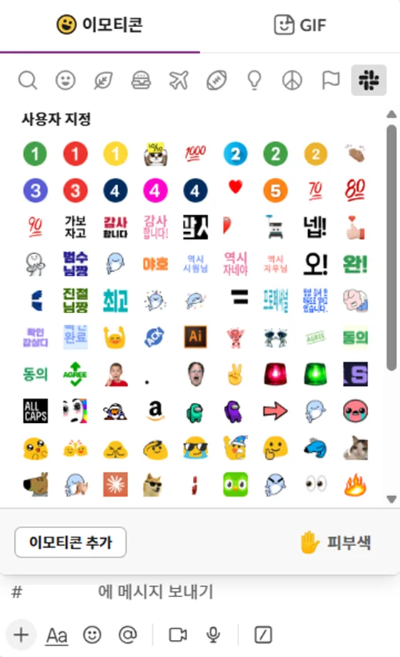 슬랙은 커스텀 이모지 기능을 제공해, 핵심가치나 조직문화를 반영한 조직만의 이모지를 만들어 사용할 수 있어요. 아기고래 이모지 생성기를 활용하면 손쉽게 커스텀 이모지를 만들 수 있습니다. 또한, 메시지에 이모지를 달아 빠르게 반응할 수 있으며, 이모티콘을 지정하여 간단한 투표처럼 활용할 수 있습니다.