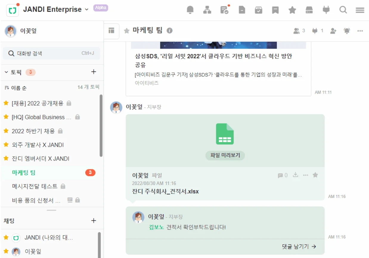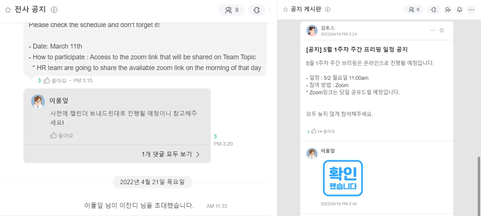 잔디는 기본 대화는 채팅창(챗뷰)에서, 공지나 정리된 문서는 게시판형 토픽(보드뷰)에서 관리해 업무 성격에 따라 공간을 나눌 수 있어요. 유료 플랜에서는 읽은 멤버 확인 기능이 지원되어 공지 전달 여부를 바로 파악할 수 있습니다.