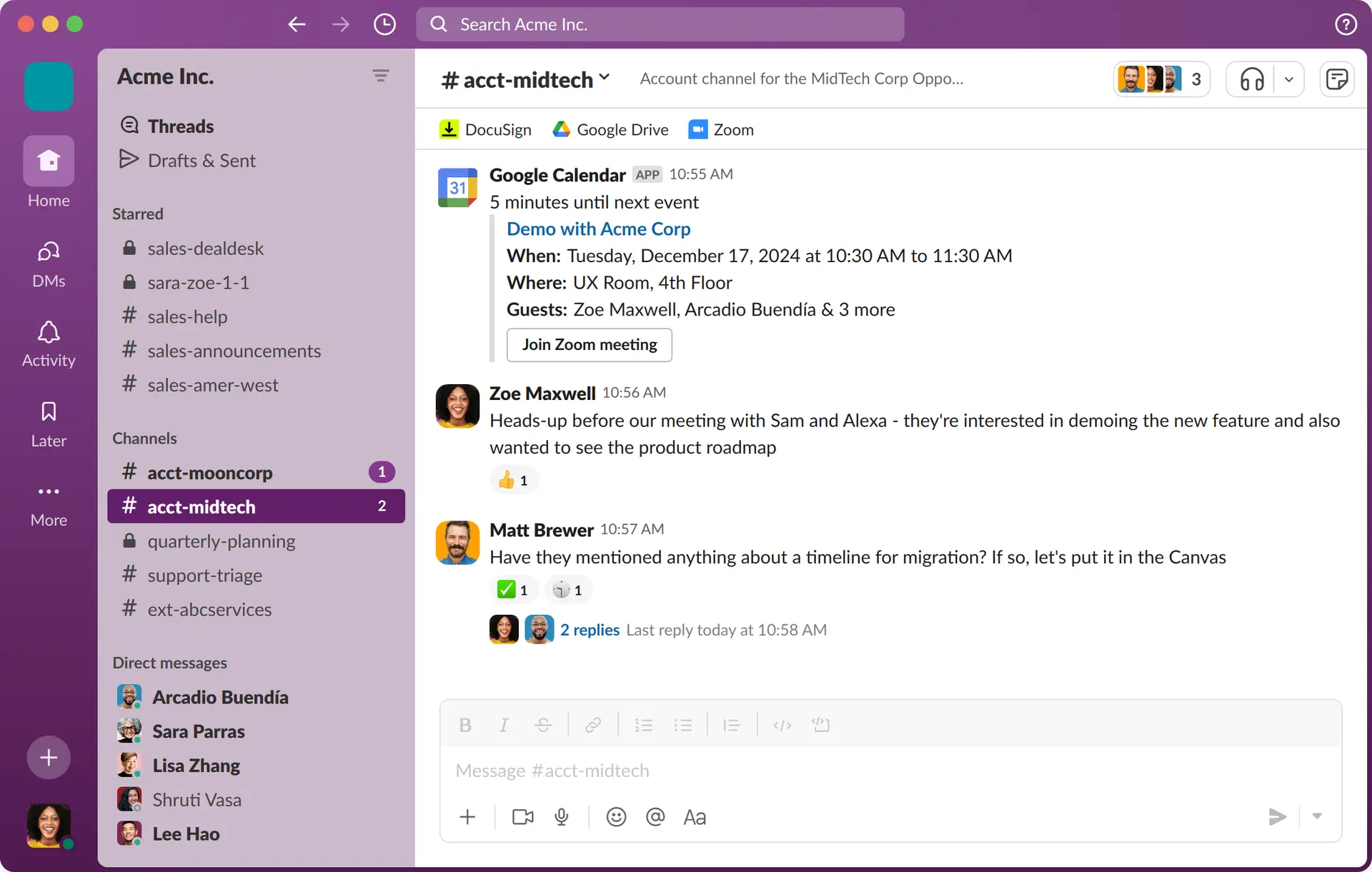 슬랙은 채널에서 관련된 논의를 진행하고, 필요한 메시지에는 스레드(Thread)를 달아 세부 대화를 분리해요. 덕분에 채널 타임라인은 핵심 논의만 깔끔하게 유지되고, 이전 대화도 스레드를 펼치면 맥락을 한 번에 확인할 수 있습니다.