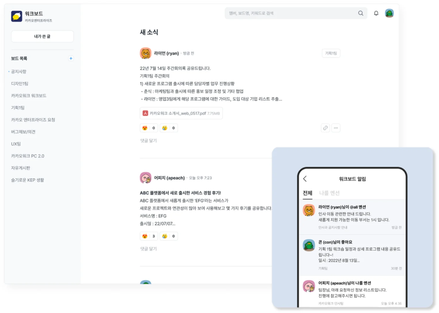 카카오워크는 여기에 워크보드(Workboard)라는 추가 소통 도구를 제공해요. 워크보드는 게시판 형태의 공간으로 팀·부서·프로젝트 단위로 보드를 만들어 공지사항, 회의록, 참고 자료를 한 곳에 정리할 수 있는 공간이에요. 각 게시글에서는 댓글로 의견을 주고받고 관련 자료를 첨부할 수 있으며, 게시글이나 댓글의 링크도 채팅창으로 공유할 수 있습니다.