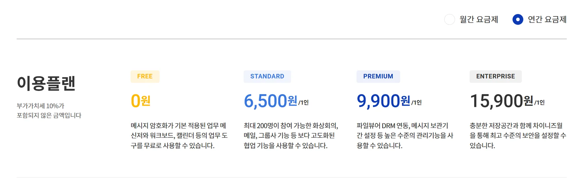카카오워크 요금제는 무료부터 Standard, Premium, Enterprise까지 총 4가지로 구성되어 있어요. 플랜별 제공 기능에 대한 정보와 가격은 카카오워크 공식 웹사이트에서 확인할 수 있습니다.