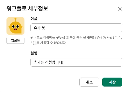 휴가 봇을 만들기 위한 워크플로의 이름과 설명을 설정해요.