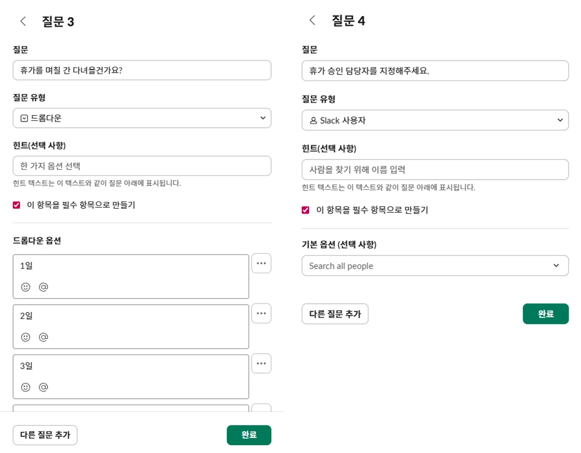 휴가 기간을 선택하는 질문 같은 경우는 직접 주관식으로 입력하기보다 드롭다운으로 선택할 수 있게 구성하면 응답이 더욱 명확해집니다.
