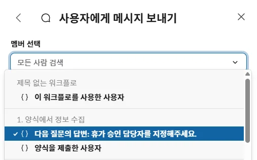 멤버 선택에서 메시지를 보내고 싶은 사용자를 선택해요.여기서는 양식에서 지정한 휴가 승인 담당자에게 메시지를 보내도록 선택할 수 있어요.