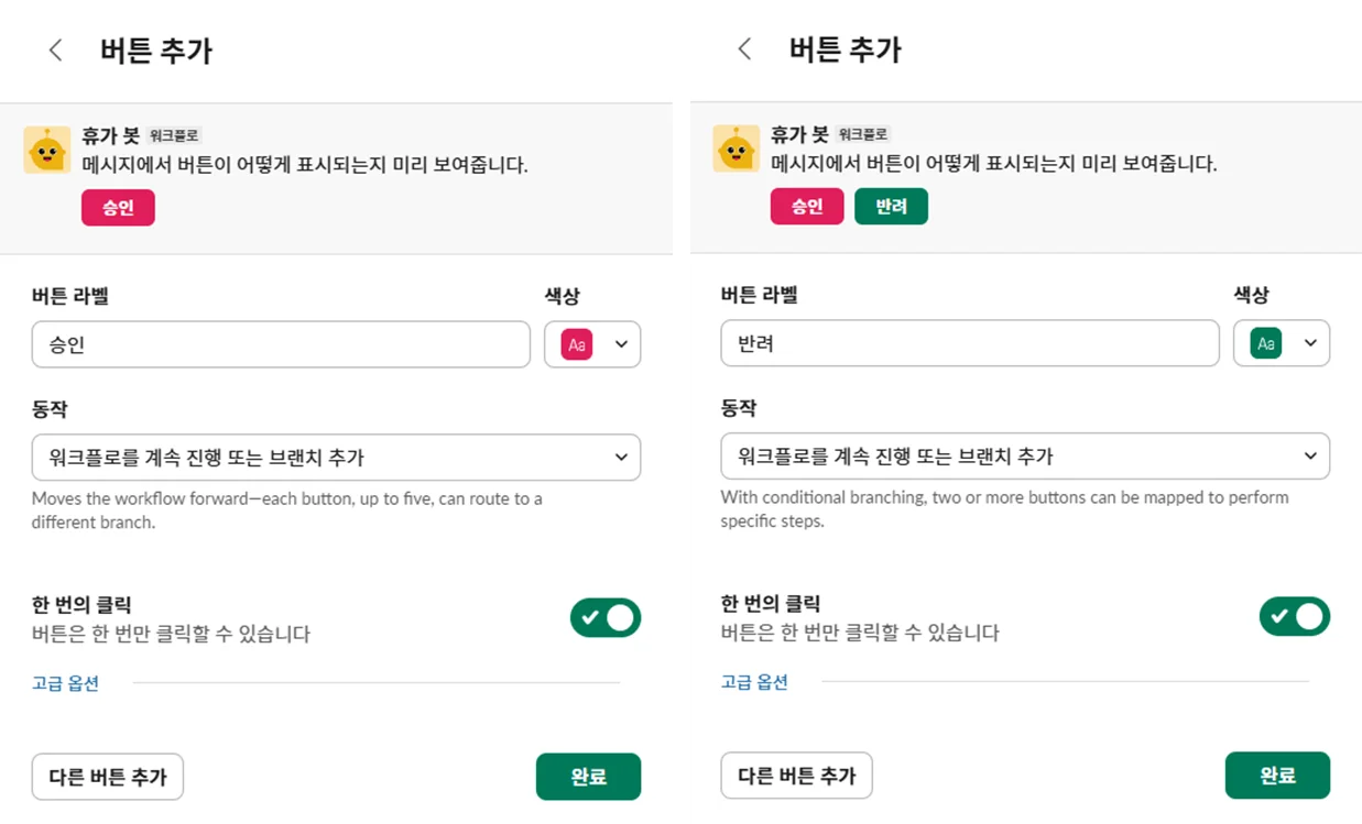 앞선 대화식 버튼을 추가할 때, 버튼 클릭 시 다음 워크플로가 진행되도록 설정해두었어요. 여기서는 담당자가 휴가를 처리한 결과가 신청자에게 전달되는 것이 다음 워크플로가 될 거예요.