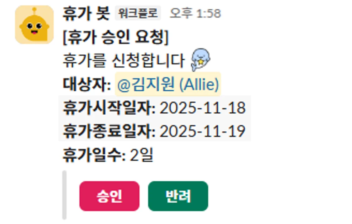 휴가 승인 담당자는 휴가 봇에게 휴가 승인 요청 메시지를 받으면, 일정을 확인하여 휴가를 처리해야 해요. 아래 메시지에서 담당자가 승인 혹은 반려 버튼을 클릭하는 것이 바로 휴가를 처리하는 과정이에요.