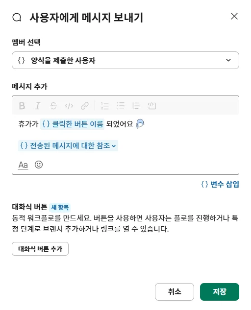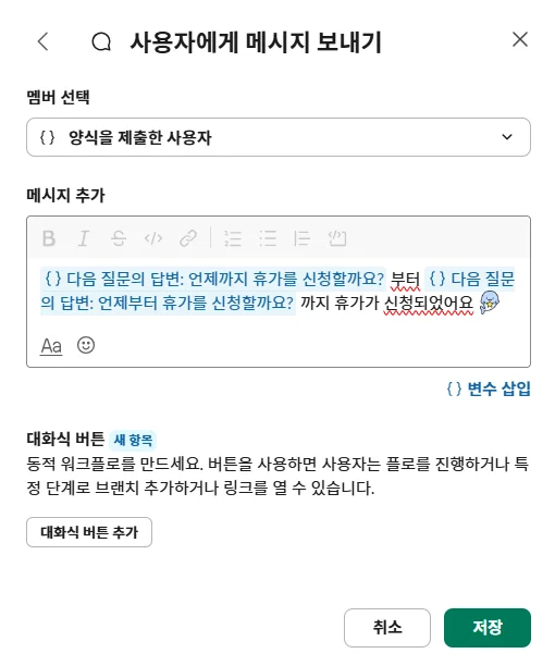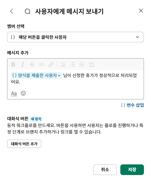 사용자에게 메시지 보내기를 선택하고해당 버튼을 클릭한 사용자를 선택해요.변수 삽입을 눌러양식을 제출한 사용자를 추가하고, 휴가가 정상적으로 처리되었다는 메시지를 작성해요.그러면 이제 휴가가 정상적으로 처리되었을 때, 담당자에게 휴가 처리가 완료되었다는 메시지가 전달됩니다.