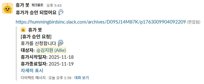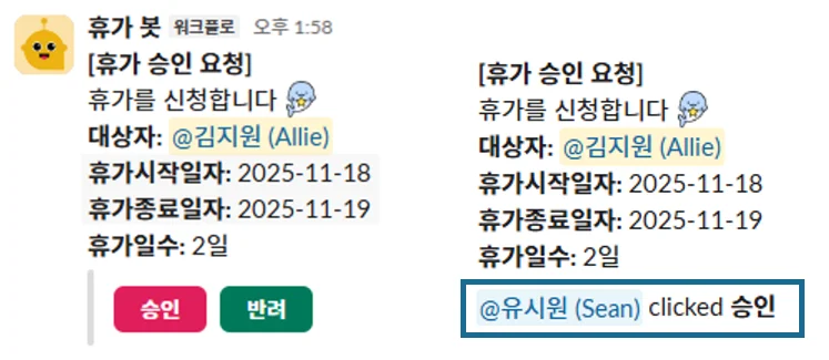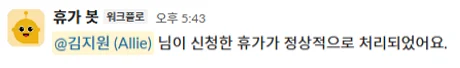 마찬가지로 버튼을 누른 담당자에게도 휴가 처리가 정상적으로 완료되었다는 메시지를 보내주면 혼선을 줄일 수 있어요.